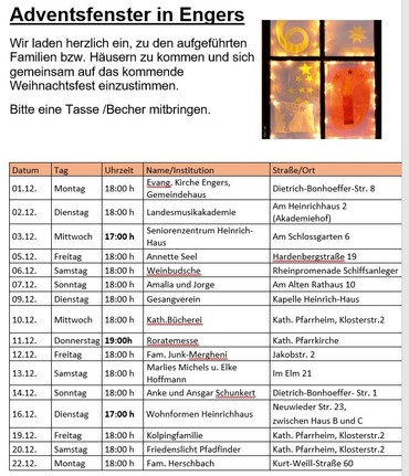 Die Adventsfenster bieten uns Gelegenheit, in der oft hektischen Vorweihnachtszeit einen Moment Inne zu halten und uns auf das Kommen Jesu einzustimmen mit Liedern, Geschichten und Gesprächen.