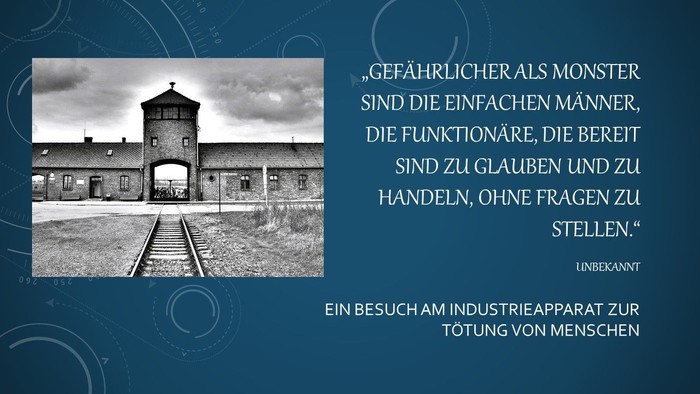 In einem Vortrag mit Bildern, die anlässlich eines Besuchs im ehemaligen KZ Auschwitz entstanden, werden unter Einbeziehung der Zuhörer*innen Einblicke und Begegnungen mit Menschen möglich. Diese waren als Täter und Opfer Teil dieses Industrieapparats zur Tötung von Menschen. Sie werden durch authentische Aussagen lebendig und lassen das Unvorstellbare und Unbegreifliche näher rücken und regen uns zu intensivem Nachdenken zur Frage des Wie? und Warum? an.